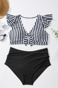 Plus Size Black Stripe Knot Cutout Ruffle Sleeve and High Waisted 2pcs Swimsuit