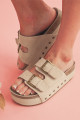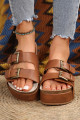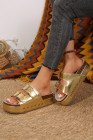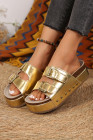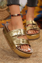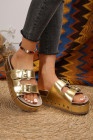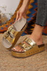 Gold Leathered Stud Dual Buckle Platform Slippers