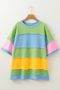 Plus Size Light Blue Color Block Exposed Seam Patchwork T Shirt