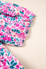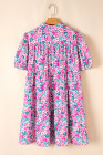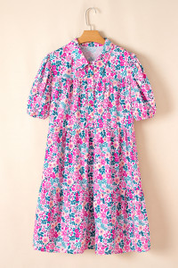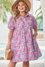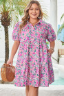 Plus Size Pink Floral Half Button Short Puff Sleeve A-line Dress