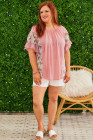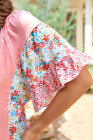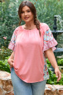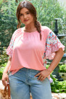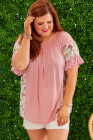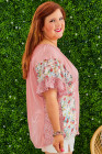 Plus Size Pink Floral Patchwork Ruffled Short Sleeve Blouse