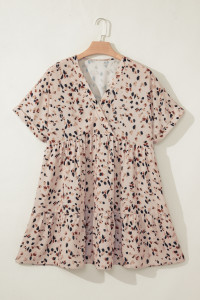Plus Size Beige Printed Surplice V Neck Cuffed Sleeve Empire Waist Dress