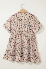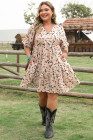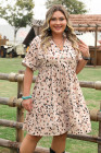 Plus Size Beige Printed Surplice V Neck Cuffed Sleeve Empire Waist Dress
