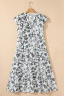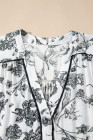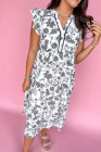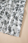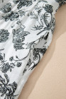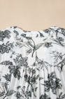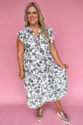 Plus Size Black Floral Print Piping Trim Notched Neck Ruffle Sleeve Long Dress