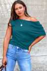 Plus Size Blue Sapphire Solid Color Asymmetric Neck Short Sleeve Blouse