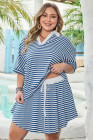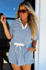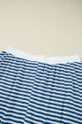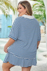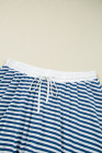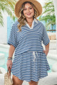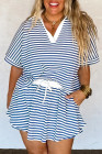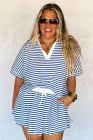 Plus Size Blue Stripe Short Sleeve Collared V Neck Top Short Set