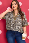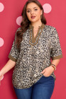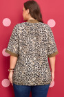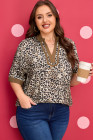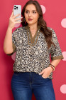 Plus Size Brown Leopard Print Crinkled Colorblock Patchwork V Neck Blouse
