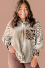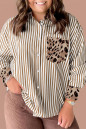 Plus Size Brown Stripe Leopard Patched Collared Chest Pocket Cuffed Long Sleeve Shirt