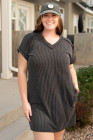 Plus Size Carbon Grey Corded V Neck T Shirt Dress with Pockets