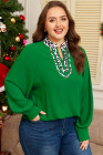 Plus Size Green Contrast Leopard Trim Split Neck Puff Sleeve Blouse