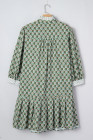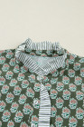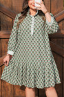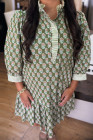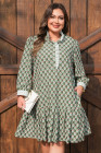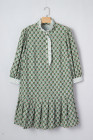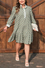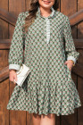 Plus Size Green Contrast Striped Frilled Collar 3/4 Sleeve Floral Dress
