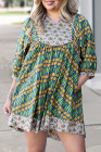 Plus Size Green Mixed Floral Print Striped Trim Loose Mini Dress