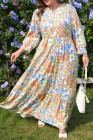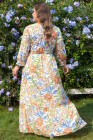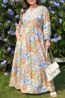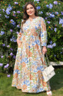 Plus Size Khaki Floral Print 3/4 Sleeves Tiered Long Dress