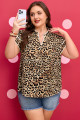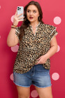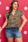 Plus Size Khaki Leopard Print Stitch Detail Ruffled Short Sleeve Blouse