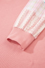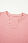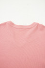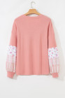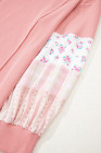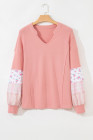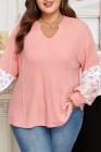 Plus Size Pink Floral Sleeve Patchwork Waffle Knit Notched V Neck Top
