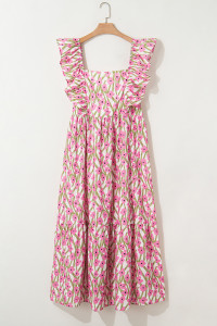 Plus Size Pink Ruffle Trim Square Neck High Waist Floral Maxi Dress