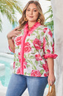 Plus Size Rose Floral Print Frilled Stripes Detail Short Sleeve Blouse