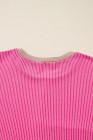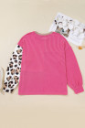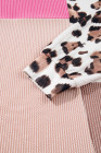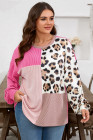 Plus Size Rose Red Twisted Ribbed Color Block Leopard Patchwork Long Sleeve Top