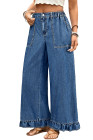 Plus Size Sail Blue Elastic Waist Ruffled Wide Leg Denim Pants