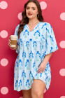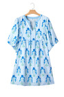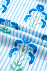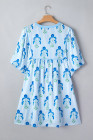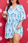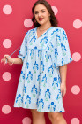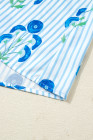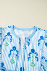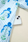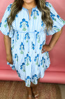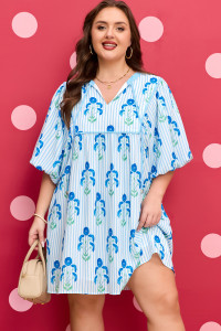 Plus Size Sky Blue Floral Striped Bubble Short Sleeve Dress