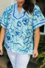 Plus Size Sky Blue Scalloped Trim Floral Short Sleeve Blouse