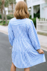 Sky Blue Stripe Seersucker Textured Notched Neck Long Puff Sleeve Tiered Curvy Dress