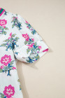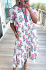 White Allover Print Contrast Split Neckline Short Puff Sleeve Curvy Dress